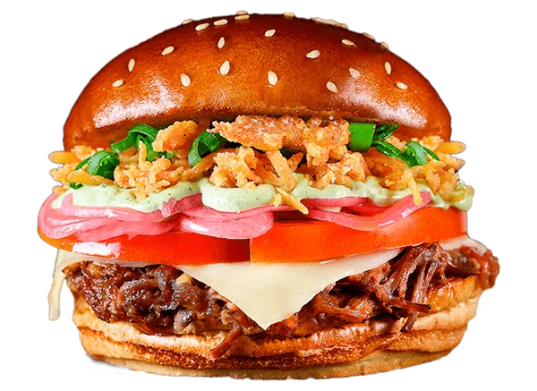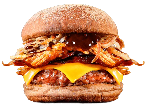 Pão australiano com burger de 170g, porco desfiado, queijo cheddar, cebola crispy e molho barbecue