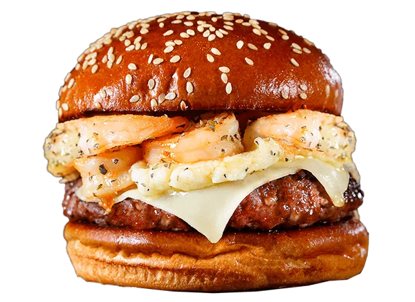 Pão brioche com burger de 170g, camarões salteados envolvidos em molho branco e cebola crispy