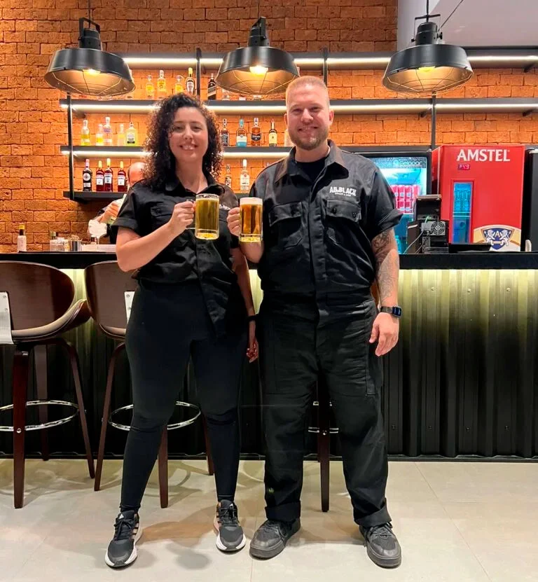 Somos Engenheiros de formação, mas apaixonados por gastronomia, eu Brenno e Lorena somos as figuras por trás da All Black burger and beer!